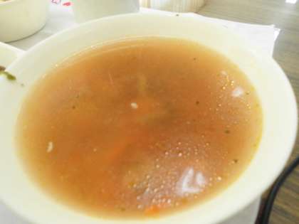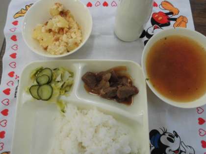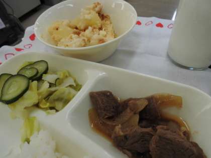卒業お祝いの献立です。サーロインのペッパー風味、トマトスープ、キャベツときゅうりのピクルス、リンゴのクランブル、ごはん、牛乳でした。