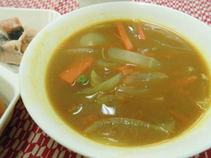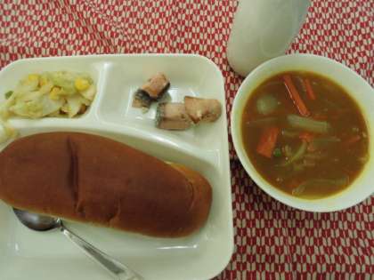 献立は、さけのガーリック風味焼き、カレースープ、野菜ソテー、パン、牛乳でした。