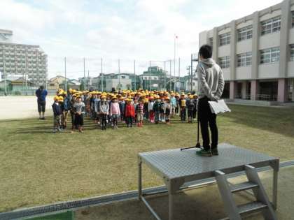 平成28年度の児童朝会は、芝生でスタートしました。