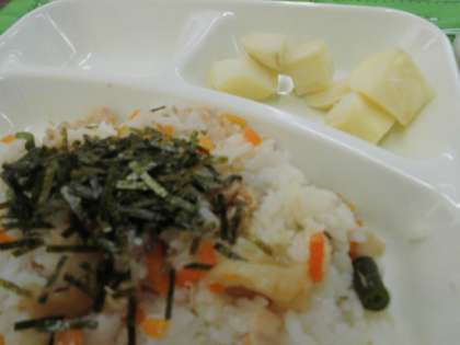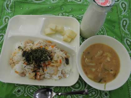 献立は、かやくご飯、みそ汁、やきじゃが、きざみのり、牛乳でした。