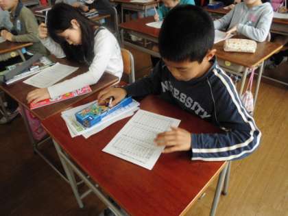 4年生では、言葉の一音一音を意識させるようなクイズ形式のプリントにチャレンジしていました。