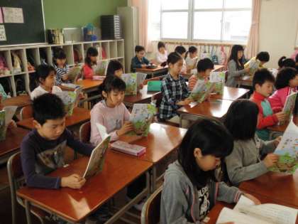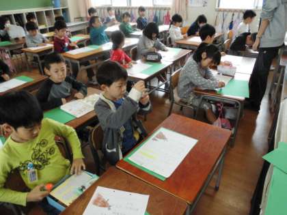 2年生は、原稿用紙にきれいに視写した詩を色画用紙に貼っていました。