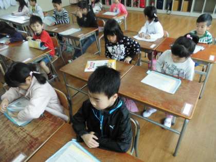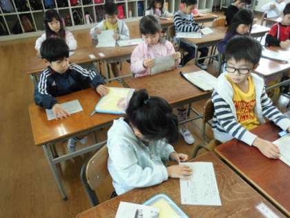 1年生は、一枚ずつプリントをていねいに折って、連絡袋に入れていました。