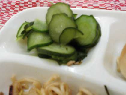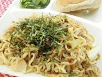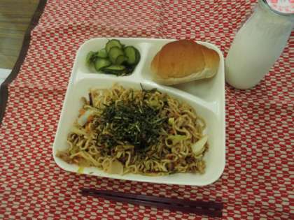 献立は、焼きそば、きゅうりのしょうがづけ、きざみのり、パン、牛乳でした。