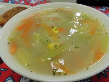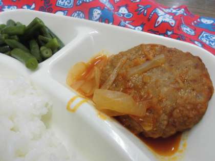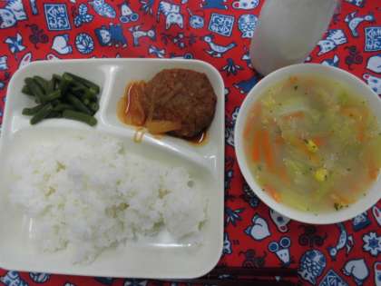 献立は、煮こみハンバーグ、コーンスープ、三度豆のサラダ、ごはん、牛乳でした。