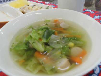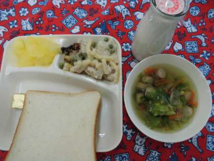 献立は、マカロニグラタン、レタスのスープ、りんご(缶)、パン、バター、牛乳でした。