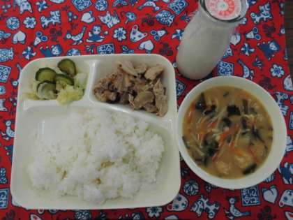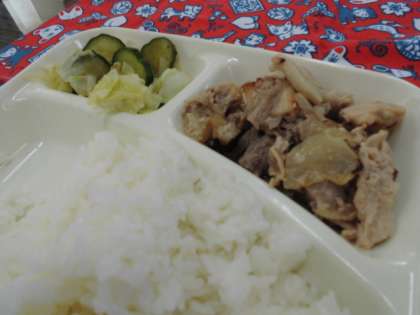 献立は、豚肉のしょうが焼き、みそ汁、キャベツときゅうりのかつお梅風味、ごはん、牛乳でした。