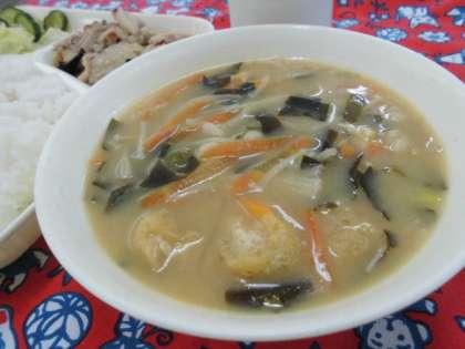 今日の献立は、たっぷりお味噌汁と豚肉のしょうが焼き定食という趣でした。