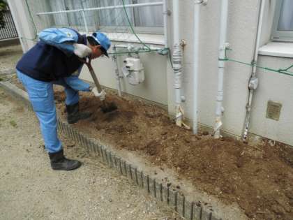今日は、先日来、土づくり、雑草抜きなどの整備をしていただいていた生野区緑化友の会グリーンコーディネーターの比嘉様と真田山公園事務局の山岸様に来ていただき、本校の三好管理作業員とともに事前の準備をしていただきました。