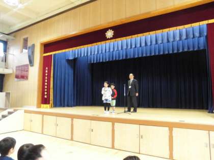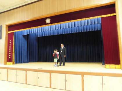 児童朝会で校長の話に続いて、転入児童の紹介を行いました。