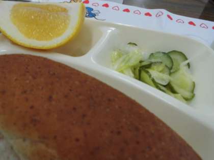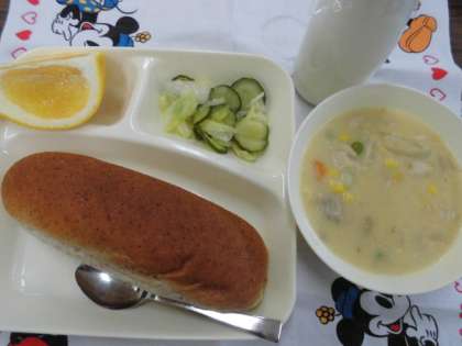 献立は、コーンクリームシチュー、グリーンサラダ、河内ばんかん、パン、牛乳でした。