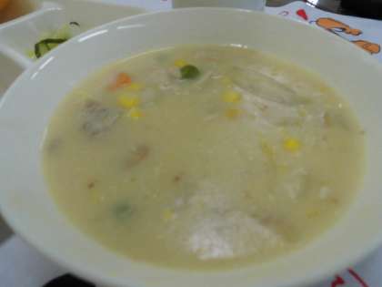 コーンクリームシチューは、鶏肉をワインで下味をつけたり、ルウも手作りだったりで、本格的な味わいです。とてもおいしくいただきました。