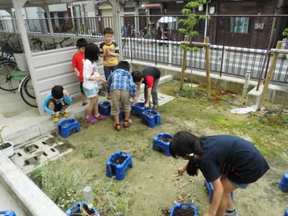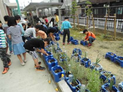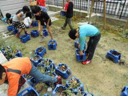 2年生は、プチトマトを植えるために、1年生の時に栽培していたチューリップを処分して土を整えました。