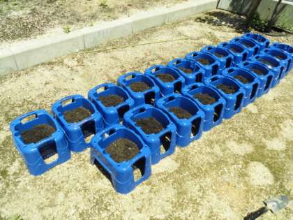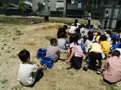 1年生がアサガオを植えるために土づくりと各自の鉢に土入れをする活動を行っていました。
