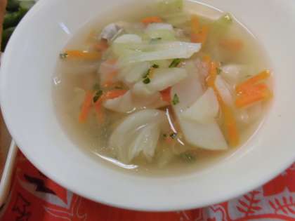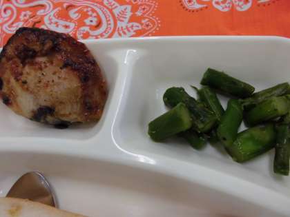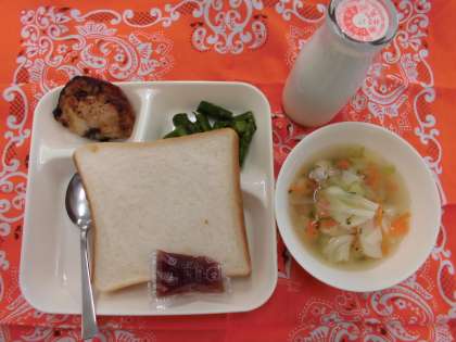 献立は、かつおのガーリックマヨネーズ焼き、スープ、グリーンアスパラガスのソテー、パン、いちびジャム、牛乳でした。