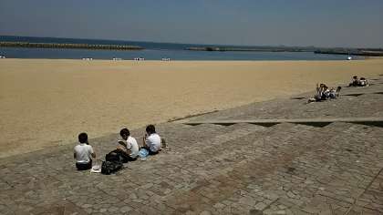 浜で、お弁当を広げています。