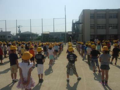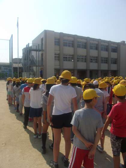 今朝の児童朝会は、土曜授業として開催する「ひがもも陸上2016」の隊形で行いました。