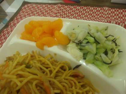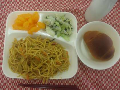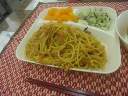 カレースパゲッティ、キャベツのひじきドレッシング、みかん(缶)、パン、牛乳でした。