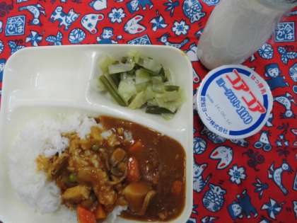 献立は、チキンカレーライス、キャベツと三度豆のサラダ、ヨーグルト、牛乳でした。
