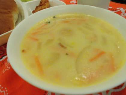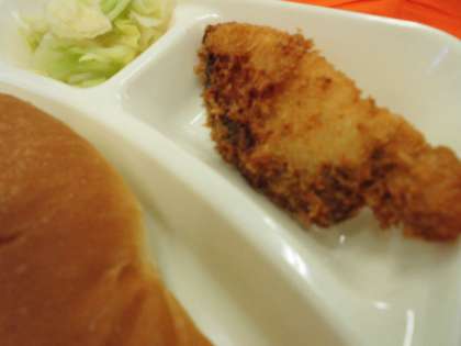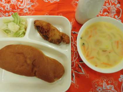 献立は、サーモンフライ、豆乳コーンスープ、キャベツのソテー、パン、牛乳でした。 豆乳コーンスープは、最後に豆乳、パセリを加えて煮ます。マイルドですが味がしっかりとついており、とてもおいしくいただきました。