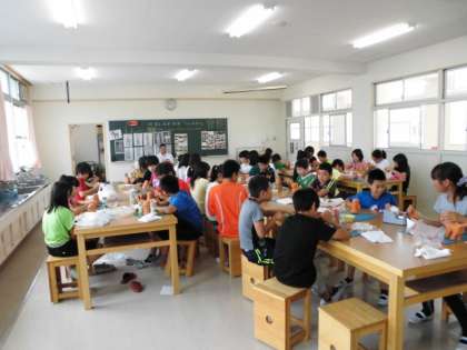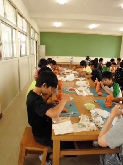 6年生が、社会科と総合的な学習の時間の取り扱いで図工室にて「埴輪づくり」をしていました。人それぞれで、個性的な埴輪ができあがりつつありました。