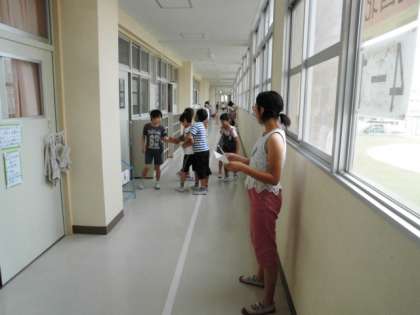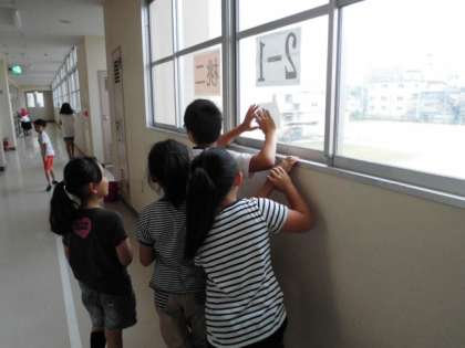 各委員会が曜日で分担して、15分休憩(2時間目と3時間目の間の休憩時間)に廊下の要所に立ち、全校児童の廊下や階段の歩き方をチェックしています。