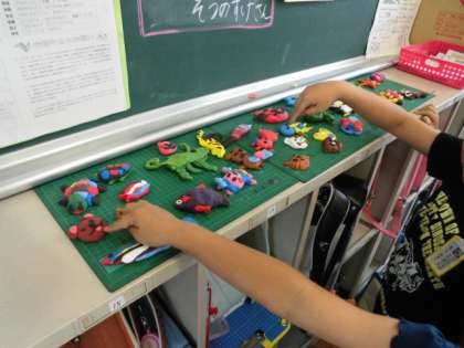 教室後ろの児童ロッカーの上に粘土でつくった作品が乾かされていました。