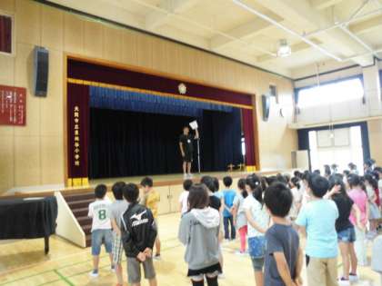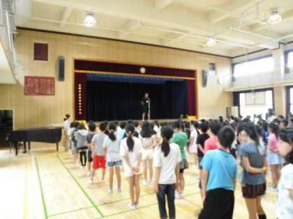 今朝は雨模様でしたので、講堂で児童朝会を行いました。