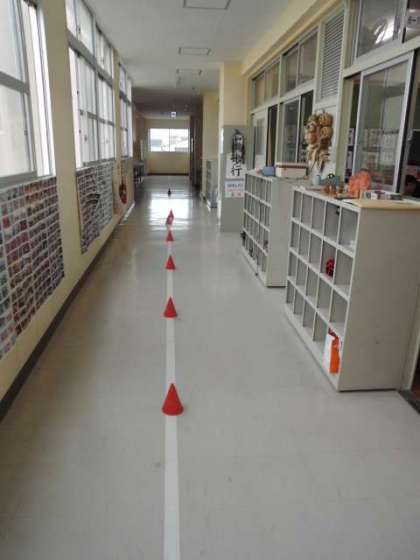 先週からの生活目標「ろうか かいだんを走らないようにしよう」を受けて、3階廊下にミニコーンが並んで置かれていました。