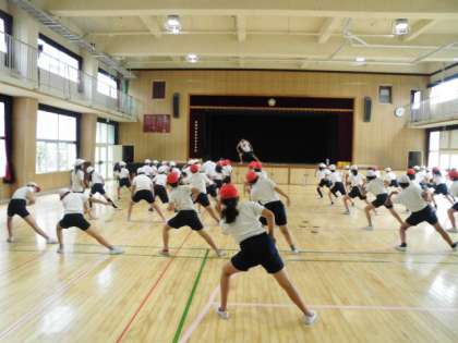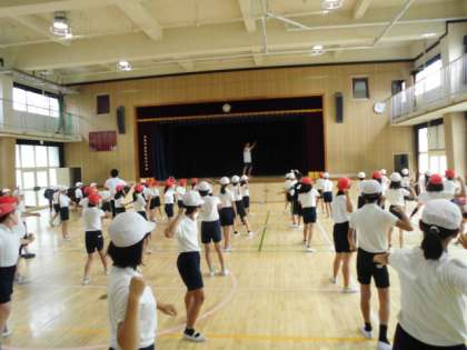 運動場が使用不可ということもあり、5・6年生が講堂で体育をしていました。