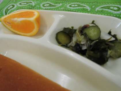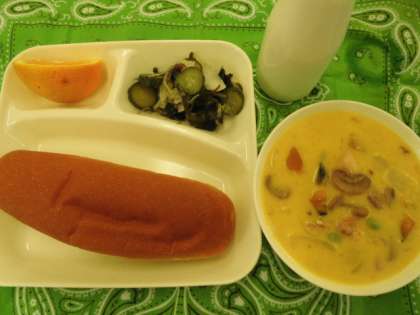 献立は、かぼちゃのクリームシチュー、ミックス海そうのサラダ、パン、オレンジ、牛乳、マーガリンでした。
