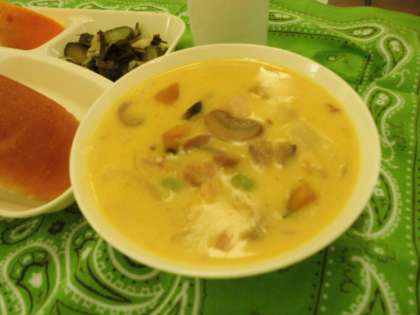 かぼちゃのクリームシチューは、下味・風味づけに、ワイン、ベーコン、たまねぎなどを使用しており、こくがあってしっかりとした味付けで、とてもおいしくいただきました。