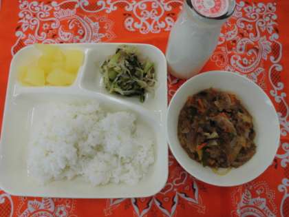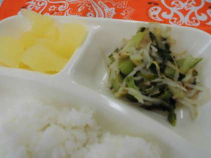 献立は、マーボーはるさめ、チンゲンサイともやしの甘酢あえ、ごはん、りんご(缶)、牛乳でした。