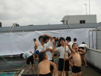 来週のプール開き、水泳指導に備えて、プール掃除を行いました。
