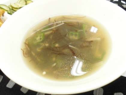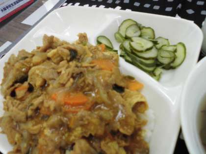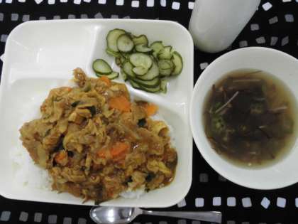 献立は、和風カレー丼、もずくとオクラのとろり汁、きゅうりの酢のもの、牛乳でした。
