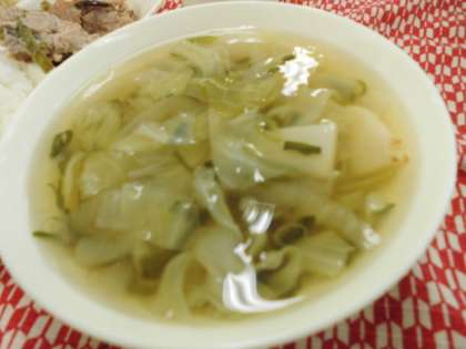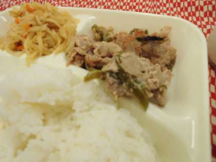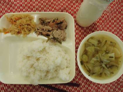 献立は、豚肉の梅風味焼き、すまし汁、切り干し大根のいため煮、ごはん、牛乳でした。