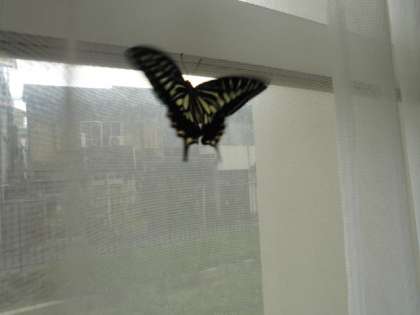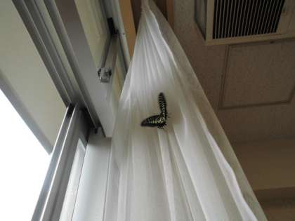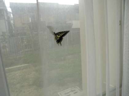 レースのカーテンの上の方に移ったかと思うと、窓から外に飛び立ちました。