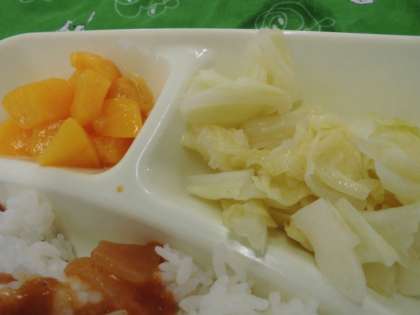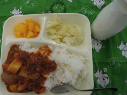 献立は、ハヤシライス、キャベツのゆずドレッシング、黄桃(缶)、牛乳でした。