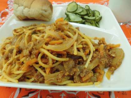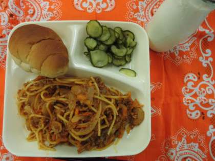 献立は、スパゲッティミートソース、きゅうりのピクルス、パン、牛乳でした。