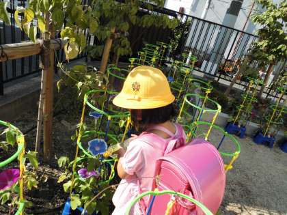 今朝も、1年生が登校してすぐアサガオの水やりをしていました。
