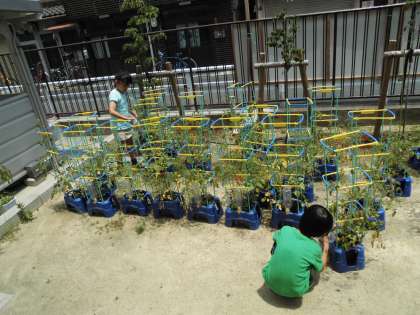 2年生が、生活科の時間に栽培していたプチトマトの熟した実を収穫していました。
