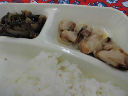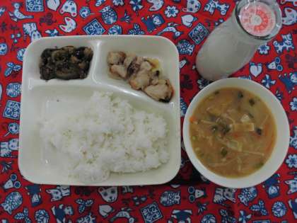 献立は、鶏肉のゆず塩焼き、みそ汁、なすのそぼろいため、ごはん、牛乳でした。
