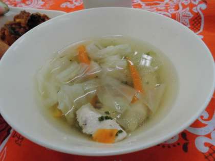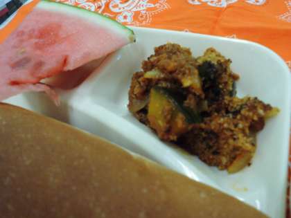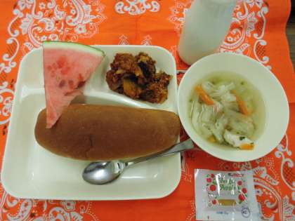 かぼちゃのミートグラタン、スープ、すいか、パン、ジャム、牛乳でした。