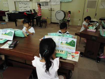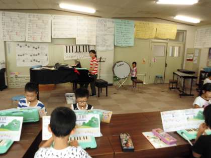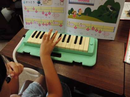 1学期の学習をふり返り、これまで学習してきた曲を鍵盤ハーモニカで吹いたり、歌ったり、リズム打ちをしたりしていました。