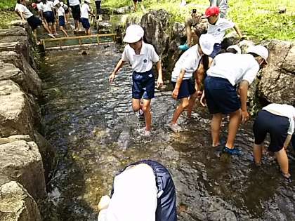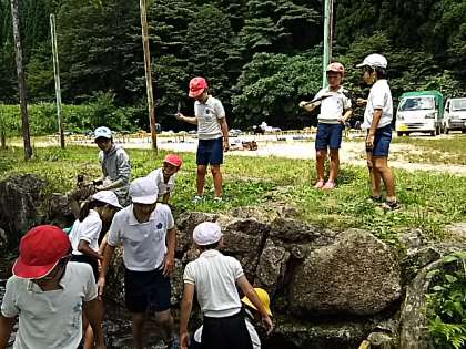 早く捕まえた子どもは、すでに魚が焼き上がって美味しそうに食べはじめました。まだ捕まえられない子どもも大勢います。