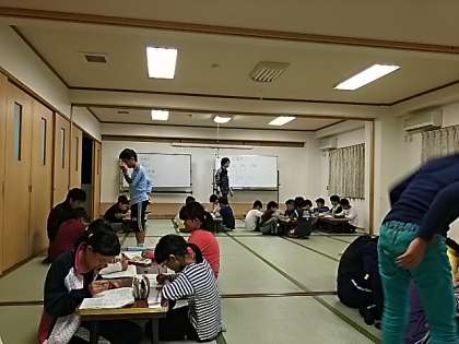 ナイトハイキングから帰ってきました。全員が元気です。途中、あちらこちらでキャンプファイアーをしていました。プラネタリウムのような星空も楽しみました。反省会が始まりました。