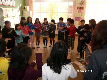 5年生は音楽で「音楽の楽しさを味わおう」です。歌いながら友だちと手をふれ合うゲームで楽しく活動していました。
