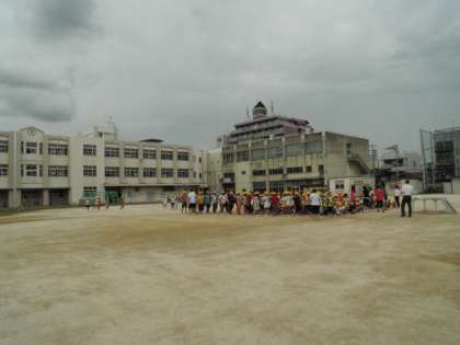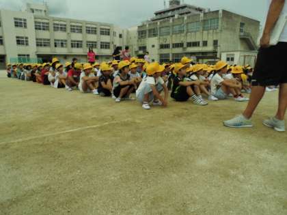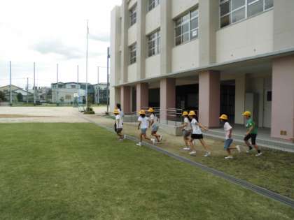 学校で被災した際は、第一次避難場所の運動場に集まります。