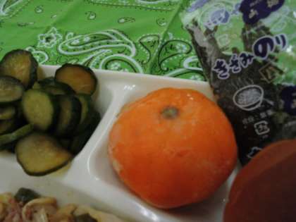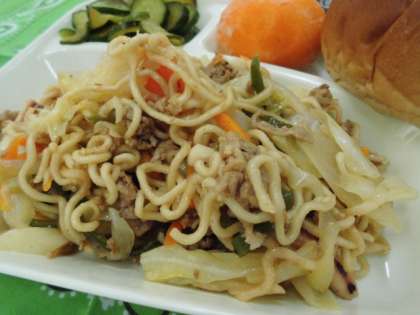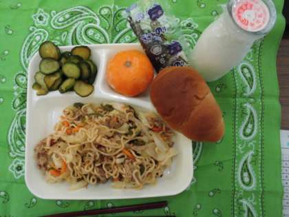 献立は、焼きそば、きゅうりの辛みづけ、冷凍みかん、パン、牛乳でした。
