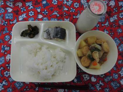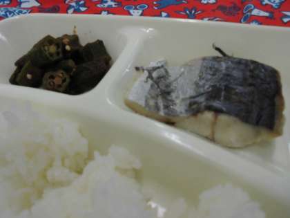 献立は、さごしの塩焼き、じゃがいもと一口がんもどきの煮物、オクラのおかかいため、ごはん、牛乳でした。